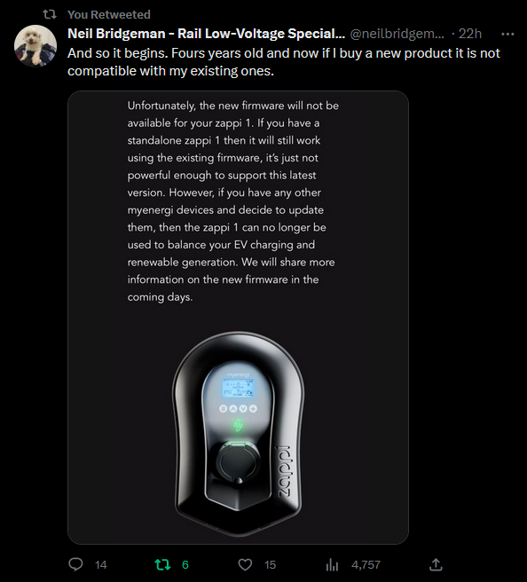 In a case of classic timing, the day after this article was originally published, Neil Bridgeman popped up on Twatter to say he'd been notified of his four year old Zappi being frozen out of firmware, unlike model 2.0 of course, which rather reinforces point 2 above. It looks like Neil risks losing the feature that allows his Zappi to divert solar energy to his car which, I'm sure you'll agree, is a pretty useful thing you wouldn't want to stop working. I suspect that feature was also a major selling point when Neil chose what chargepoint to whack onto his wall not so long ago.